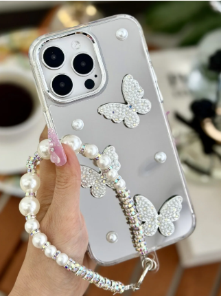 Iphone 14 PROMAX Aynalı Charm Kelebek Tasarımlı Oyuncaklı Silikon Kılıf